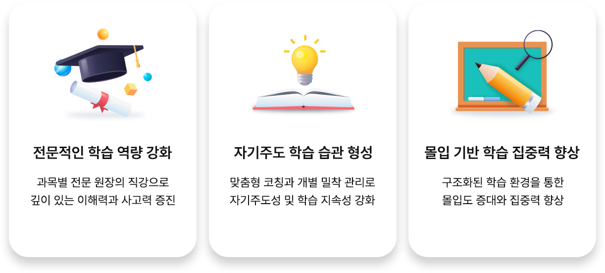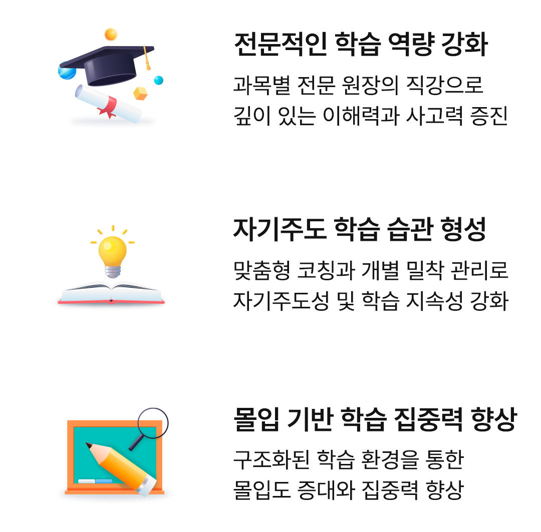단순한 지식 전달을 넘어, 학생이 스스로 공부하는 방법을 ‘행동’으로 익힐 수 있도록 실천 중심의 수업이 이루어집니다. 또한 학습에 몰입 할 수 있도록 환경을 구조화하여, 불필요한 방해 요소를 줄이고 집중력을 극대화합니다.