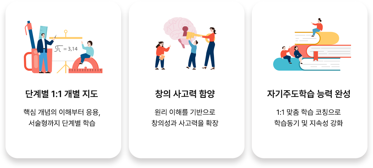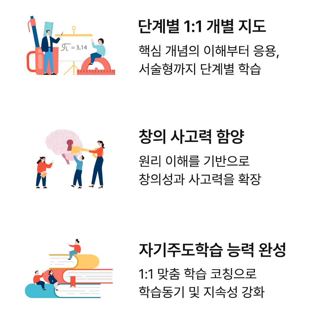 1:1 학습 플랜, 개별 밀착지도, 심화학습, 오답클리닉까지 철저한 개별 맞춤 시스템으로